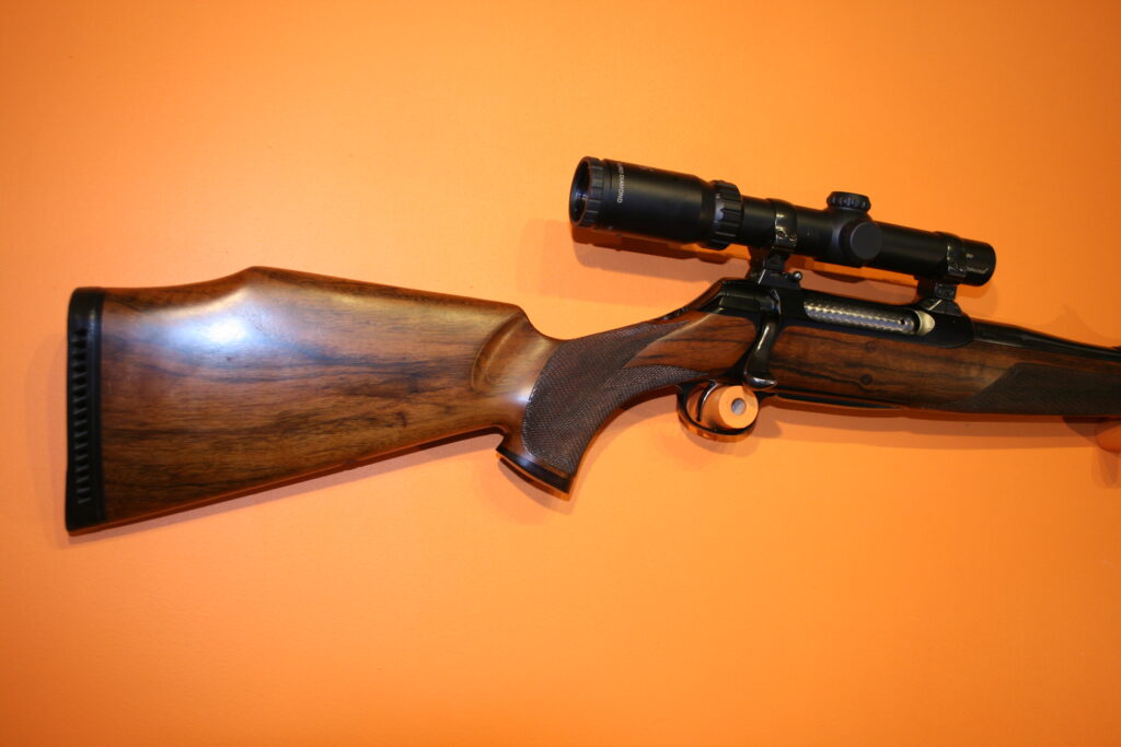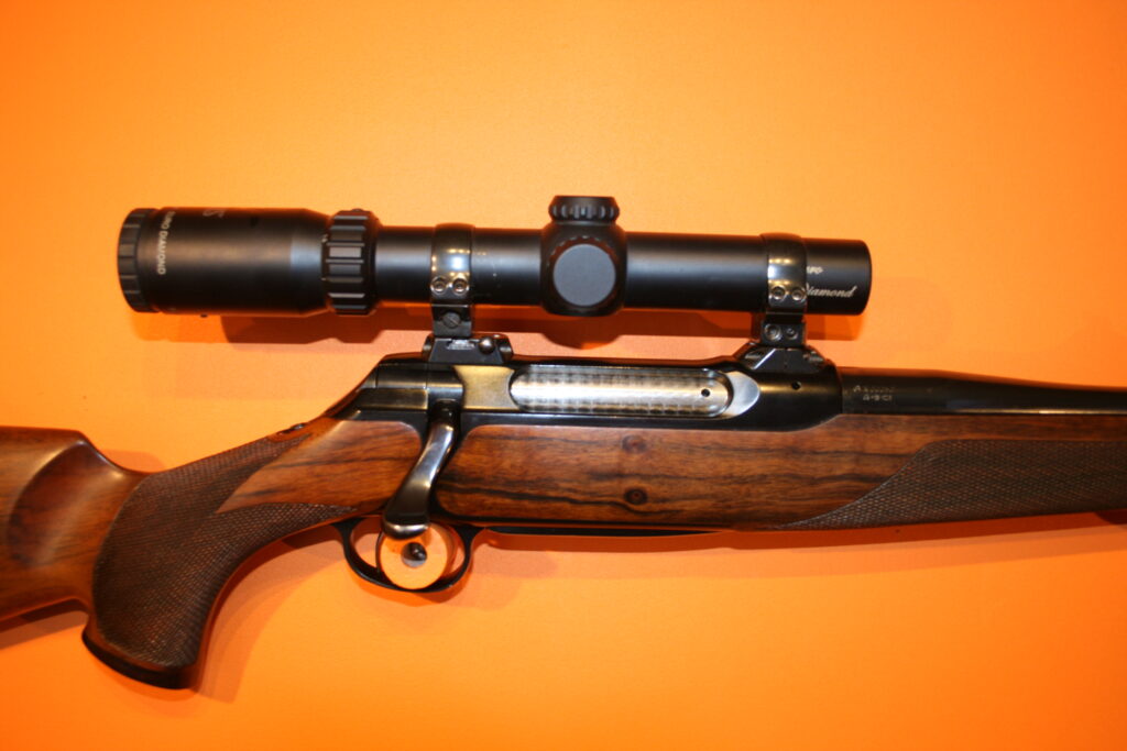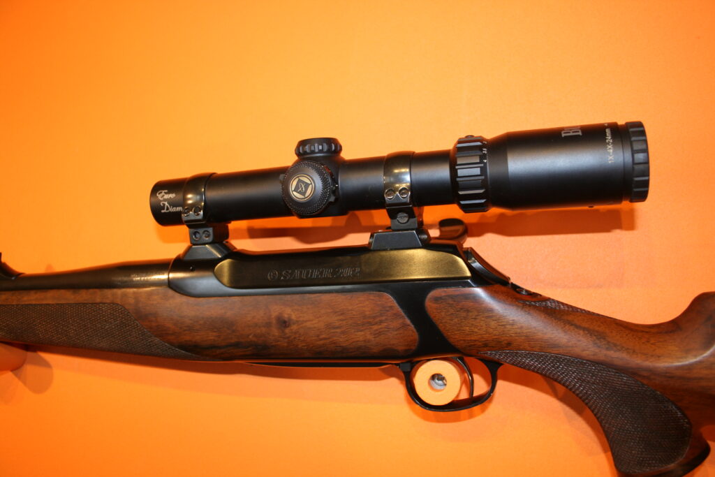 Carabine SAUER 202 en très bon état avec sa lunette de battue. Bois magnifiques. Culasse très fluide.