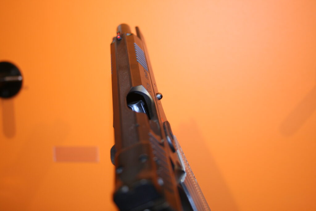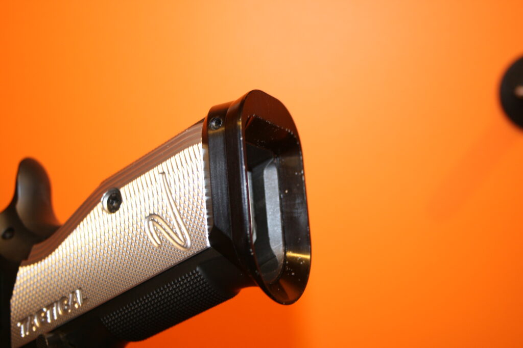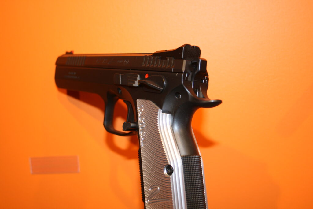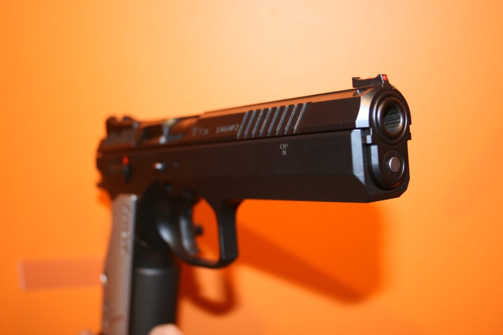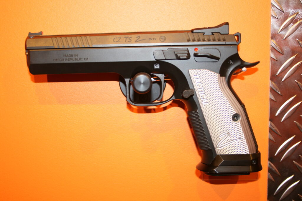 Pistolet CZ Tactical Sport 2. Puit de chargeur évasé. Cran de mire fixe et guidon fibre rouge. Traces de manipulation, mais arme restante néanmoins en bon état.