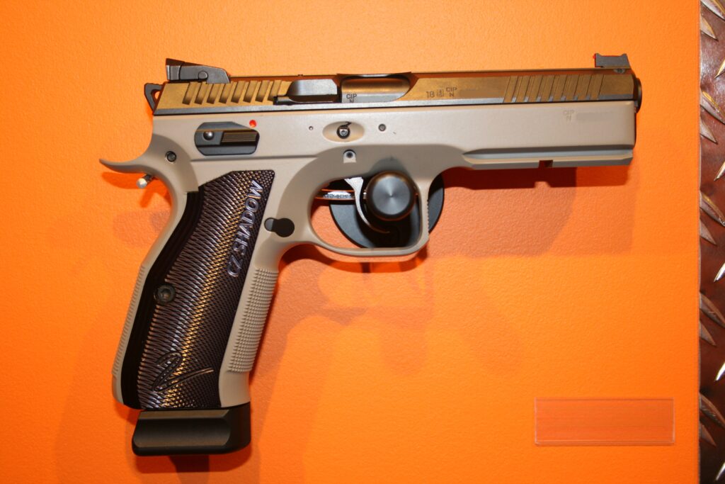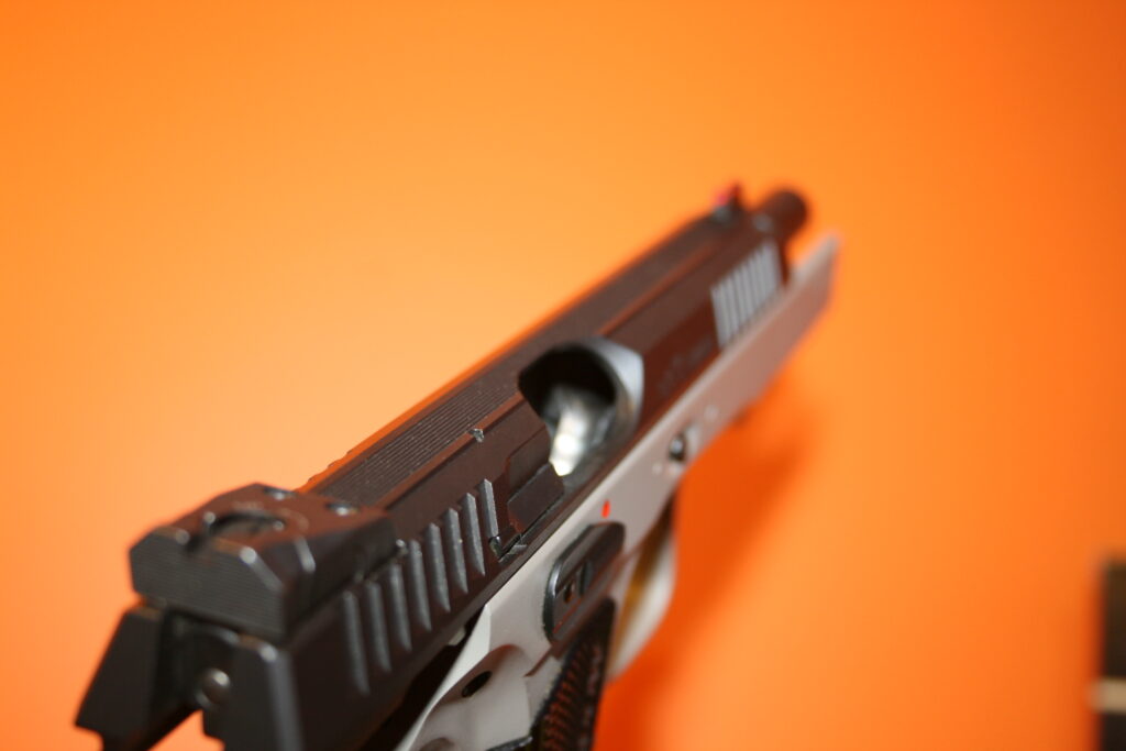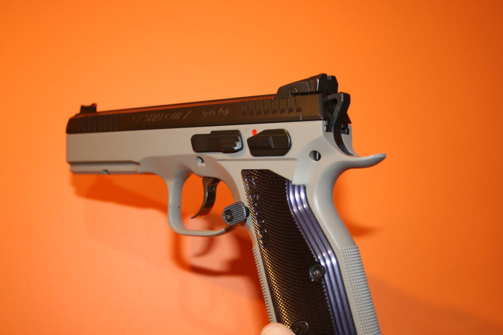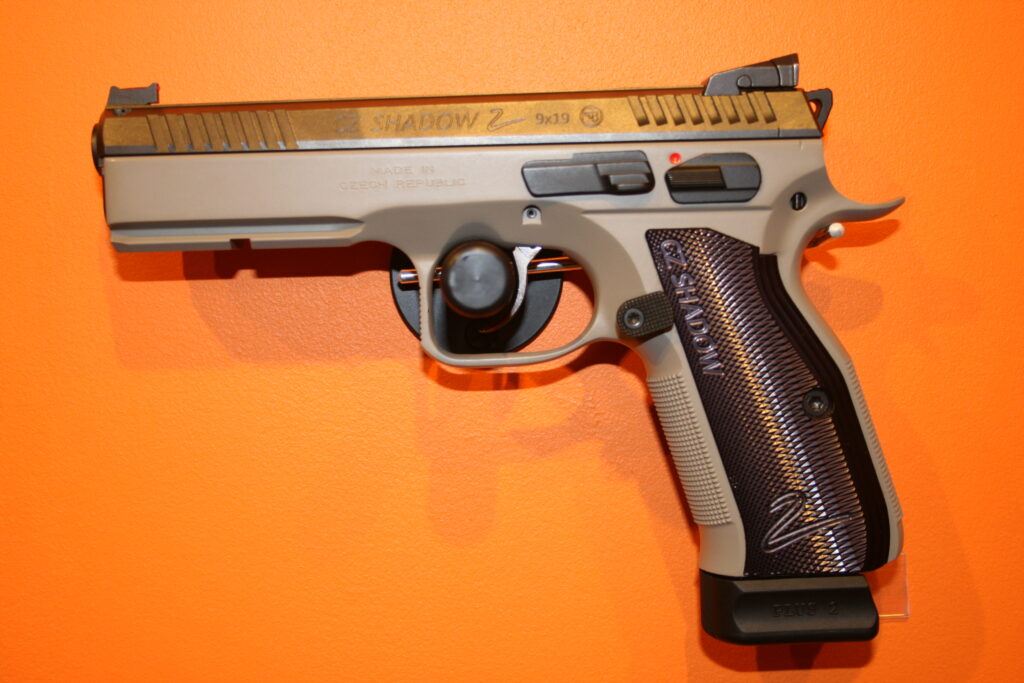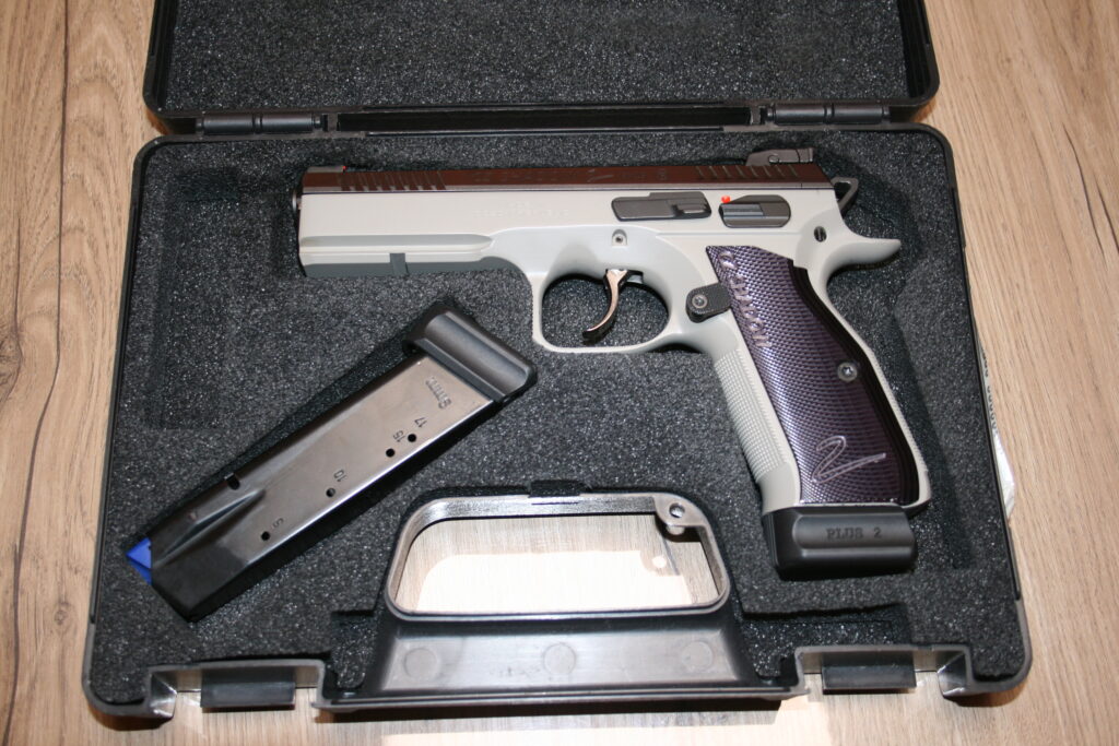 Pistolet CZ SHADOW 2 URBAN GREY. Modèle en double action. Cran de mire réglable et guidon fibre rouge. Traces de manipulations notamment au niveau du puis de chargeur. Fourni avec sa mallette d’origine et ses deux chargeurs.