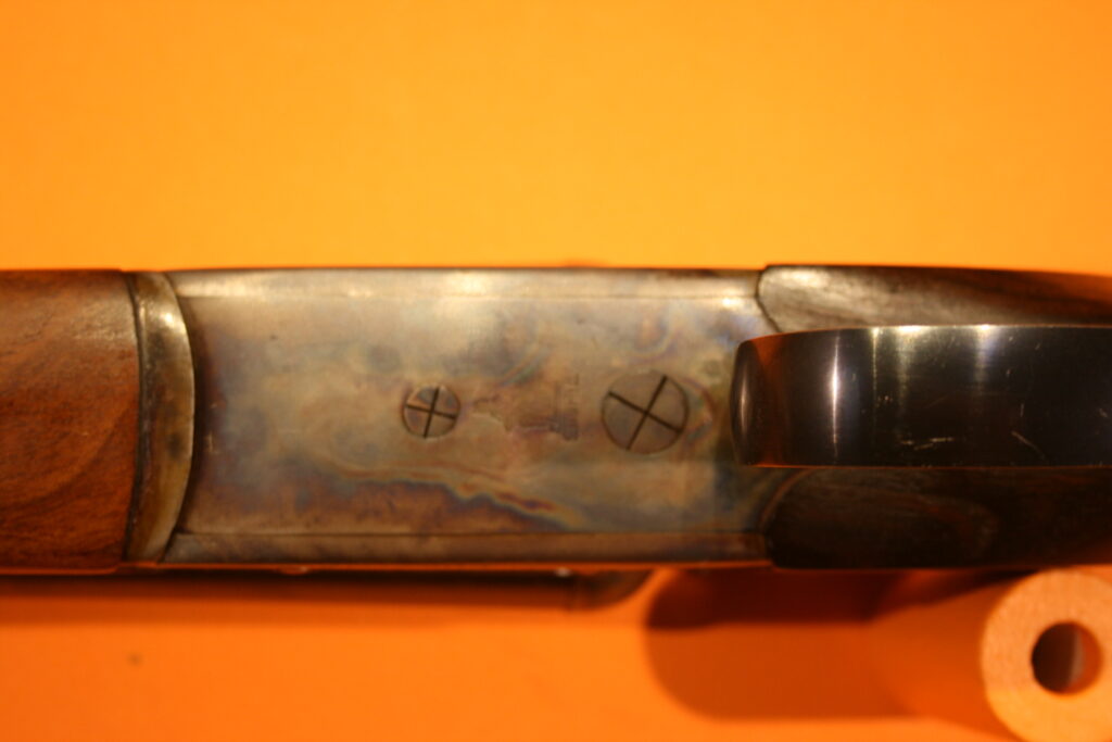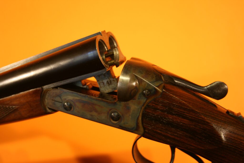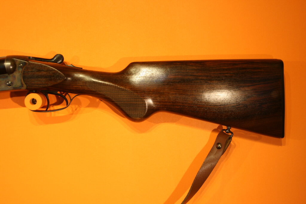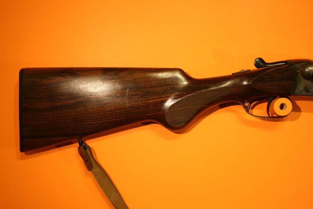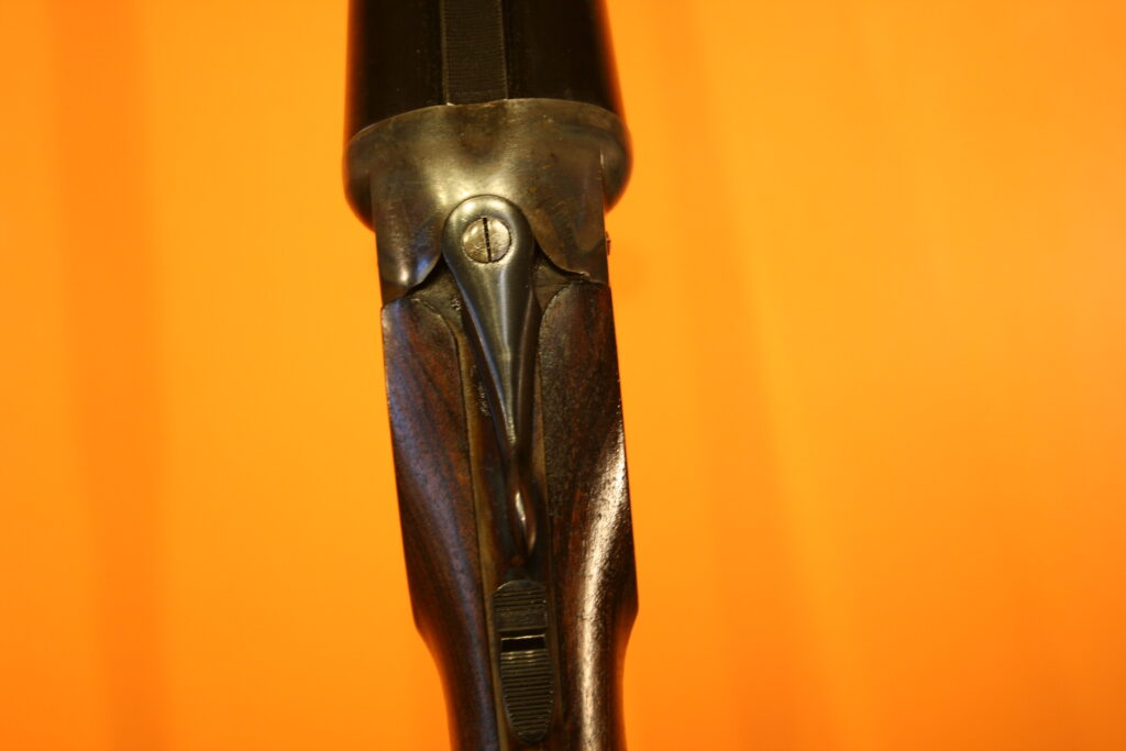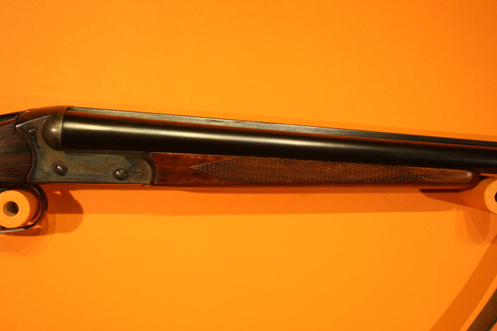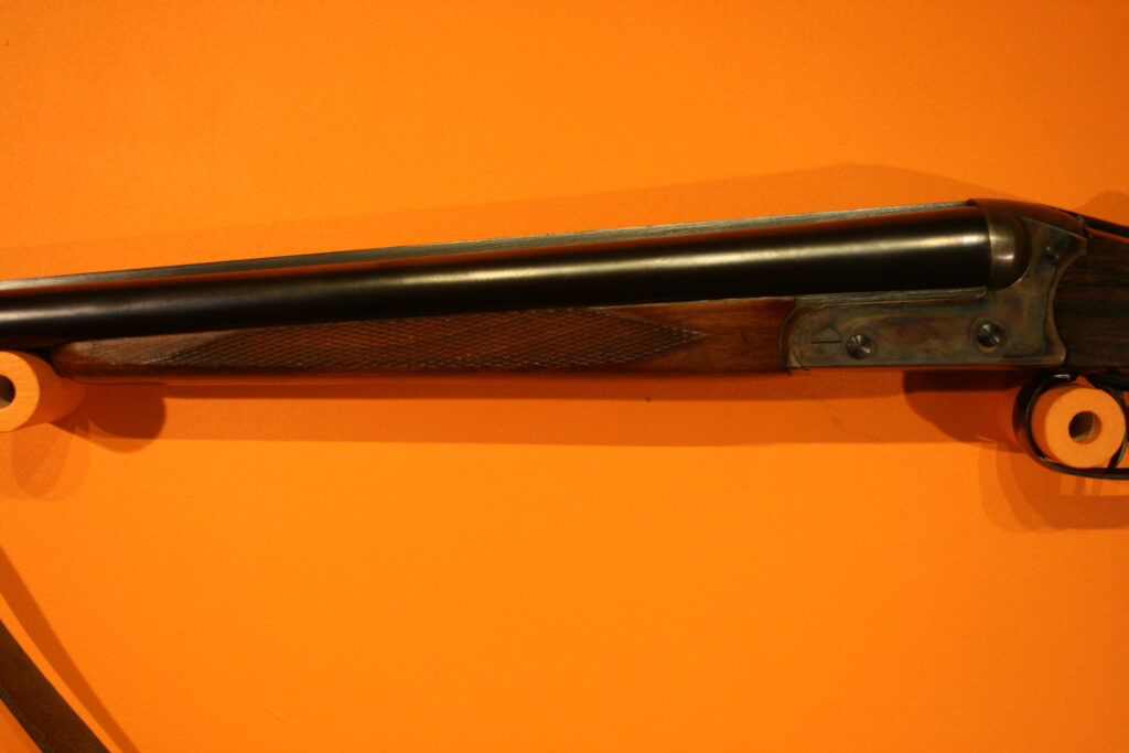 Magnifique fusil juxtaposé du fabricant allemand SULH. Calibre 16/70. Canons de 71cm. Chokes fixes ½ et full. Quelques petits coups et légères rayures. Bronzage manquant légèrement au bout du canon mais reste globalement très présentable. Beau jaspage sur la bascule. Absence de jeu. Fourni avec bretelle en cuir.