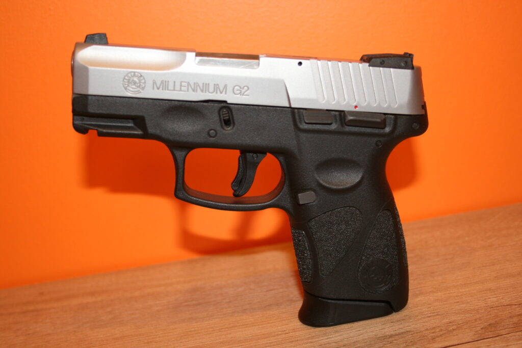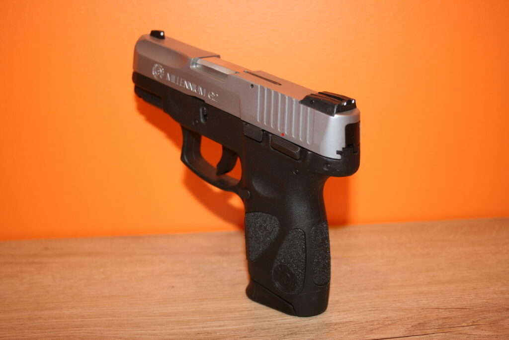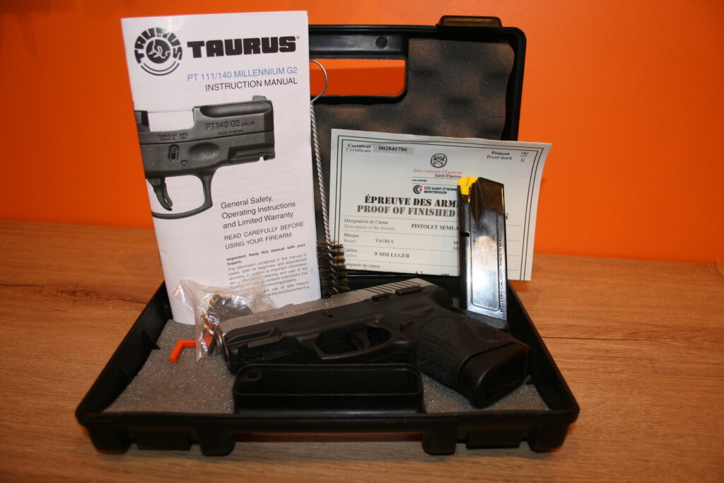 Pistolet TAURUS PT 111 MILLENNIUM G2. Calibre 9×19. Modèle très compact mais bonne préhension et bon grip. Chargeur de 12 coups. Bonne mécanique. Petite arme bien sympathique au tir. Fourni avec sa mallette d’origine TAURUS comprenant un chargeur supplémentaire, un écouvillon, un témoin de chambre vide, le certificat d’épreuve et la documentation.