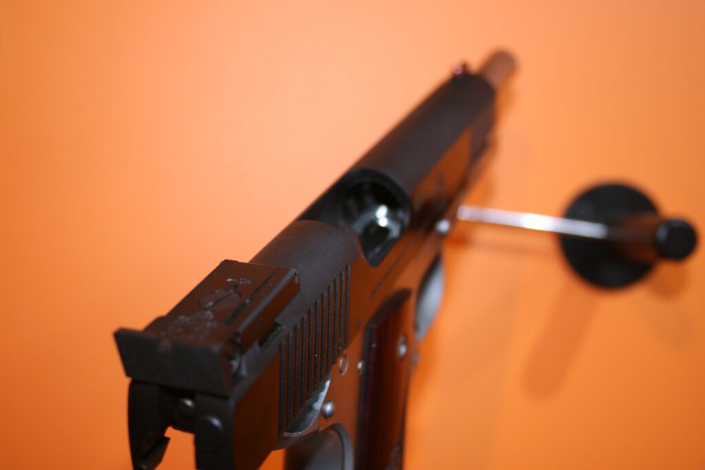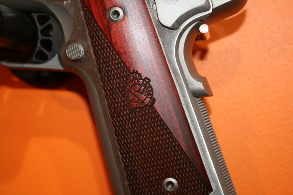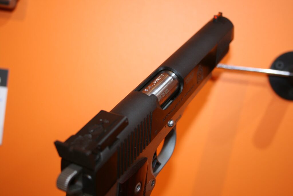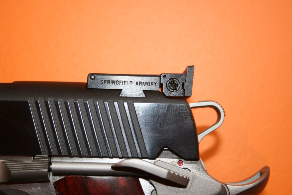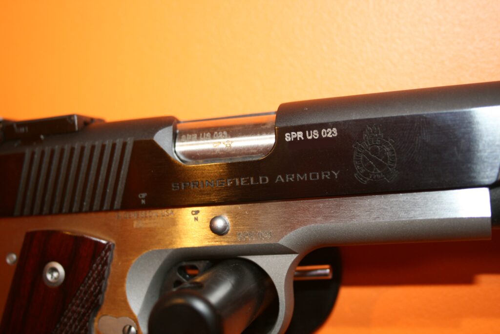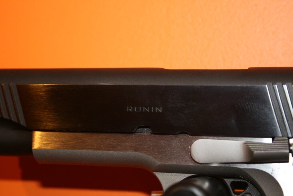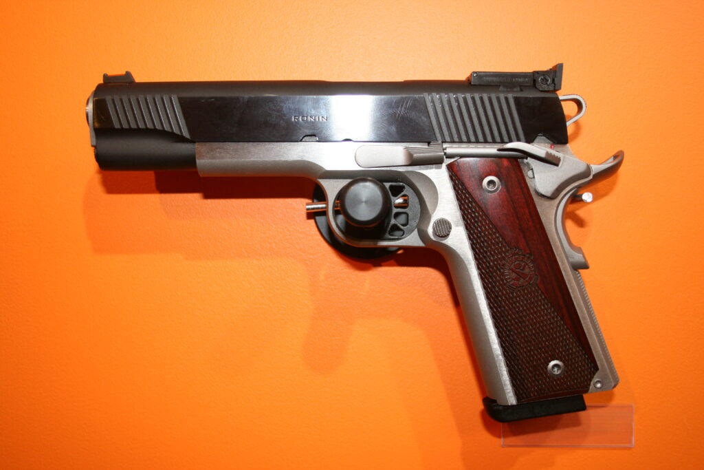 Pistolet de type 1911 de la marque SPRINGFIELD. Modèle RONIN en calibre .45 ACP. Cran de mire réglable et guidon fibre. Superbes plaquettes bois. Très belles finitions. Bon ajustements. Arme en très bon état mécanique et esthétique.