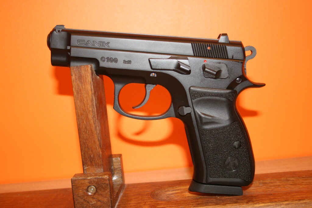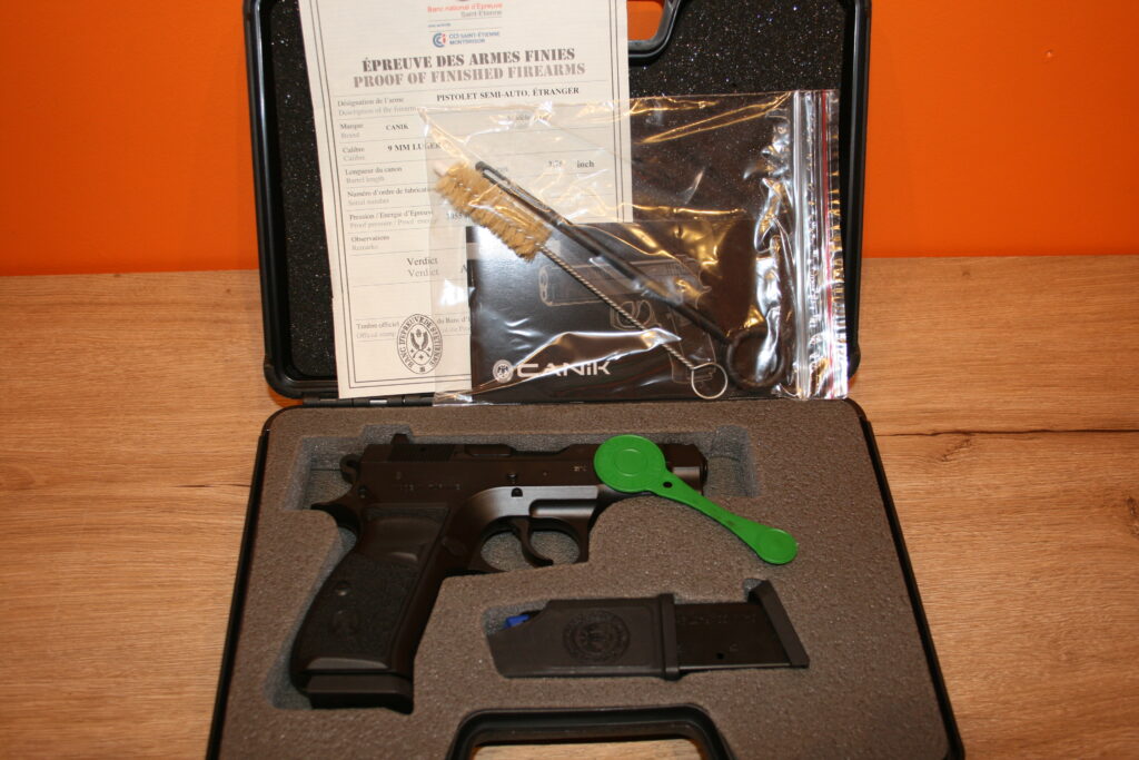 Pistolet de la marque CANIK (vente numéro 1 aux Etats-Unis). Modèle C100, très proche d’un CZ 75 compact. Calibre 9×19. Carcasse acier. Simple et double action. Poids : 750 grammes. Arme très fiable et agréable au tir aujourd’hui introuvable de surcroit neuve. Fournie avec sa mallette CANIK d’origine comprenant deux chargeurs, une chargette, un témoin de chambre vide, un necessaire d’entretien, la documentation et le certificat du banc d’épreuve.