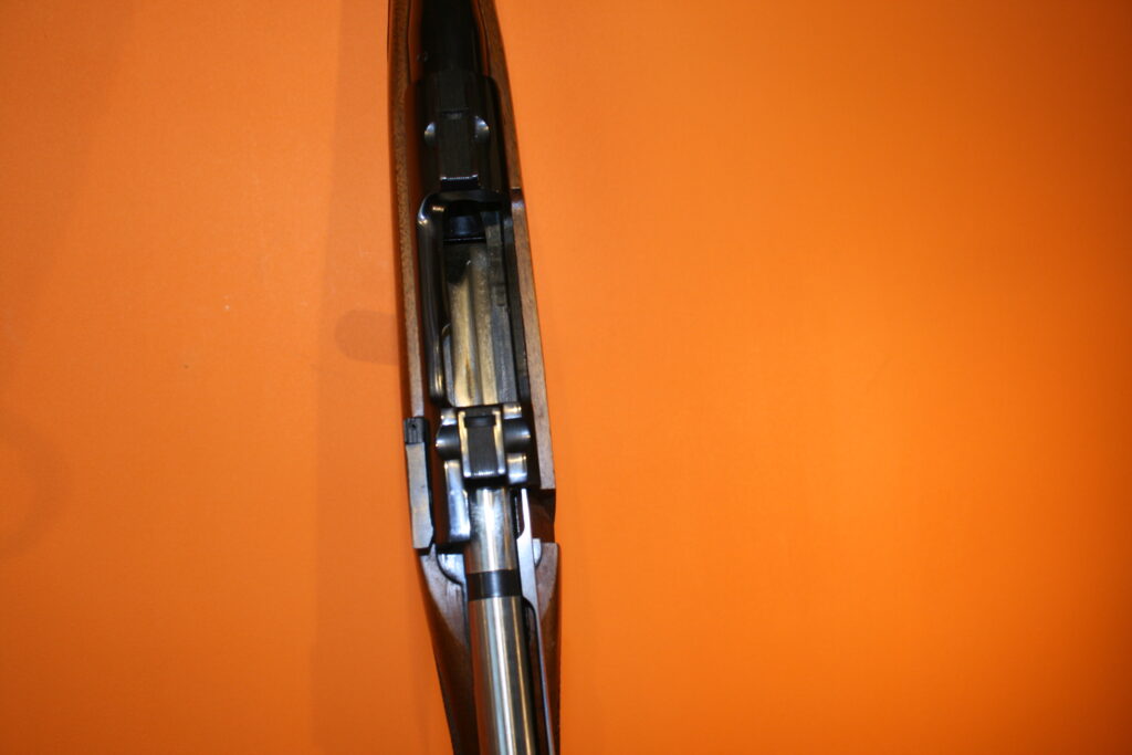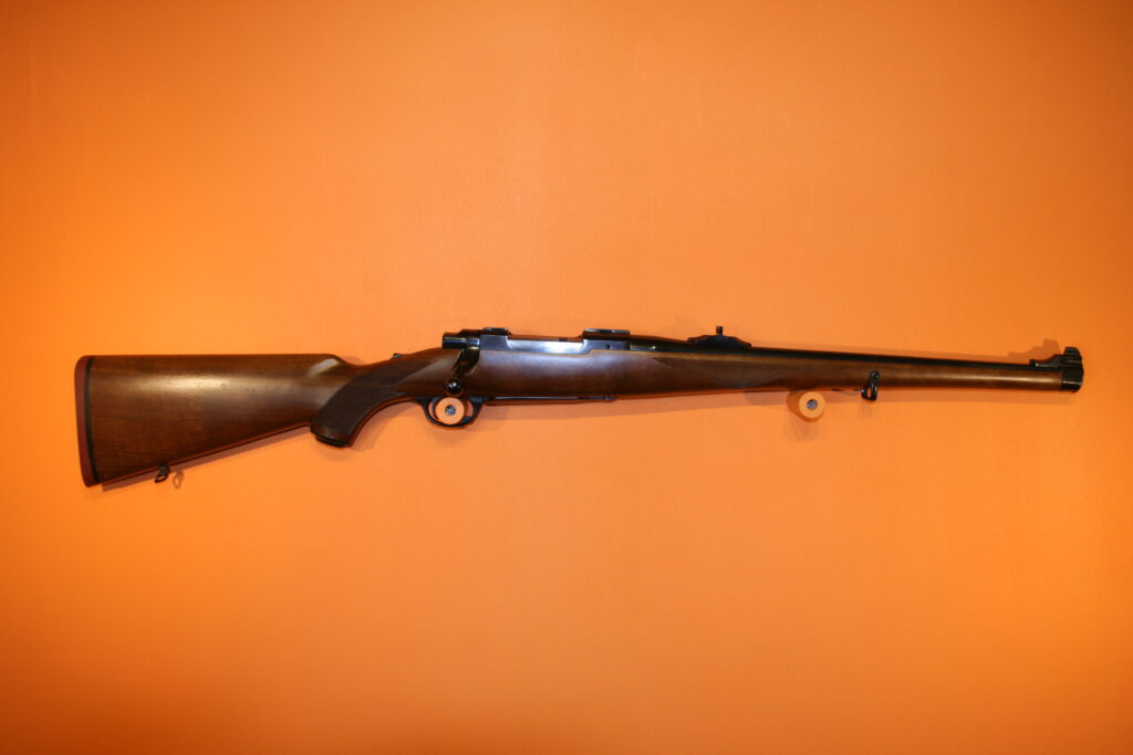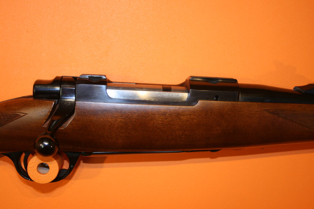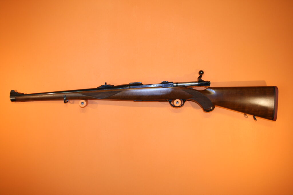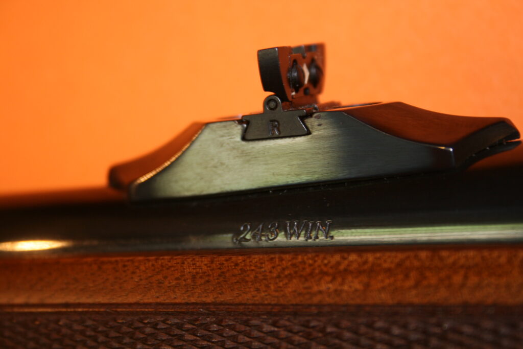 Carabine d’affût RUGER M77. Modèle à fût long en calibre .243 Winchester. Poids à vide : 3 Kg. Longueur du canon : 47 cm. Longueur de crosse : 34,5 cm. Longueur totale : 97,5 cm. Grenadières présentes. Départ de détente franc. Très bonne mécanique de type “Mauser”, fluide et inusable. Hausse rabattable et réglable. Magasin d’une capacité de 5 cartouches. Belle occasion présentant très peu de traces d’usage.