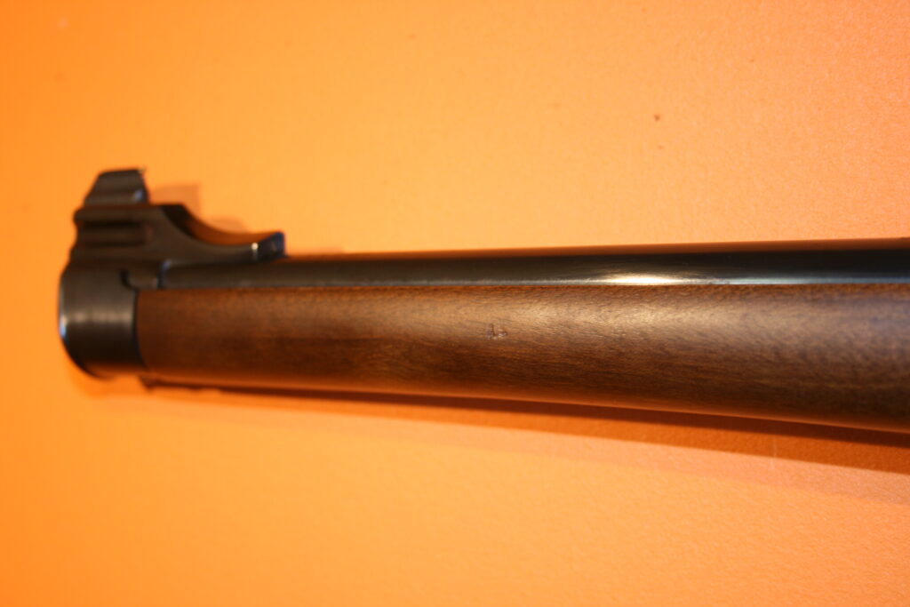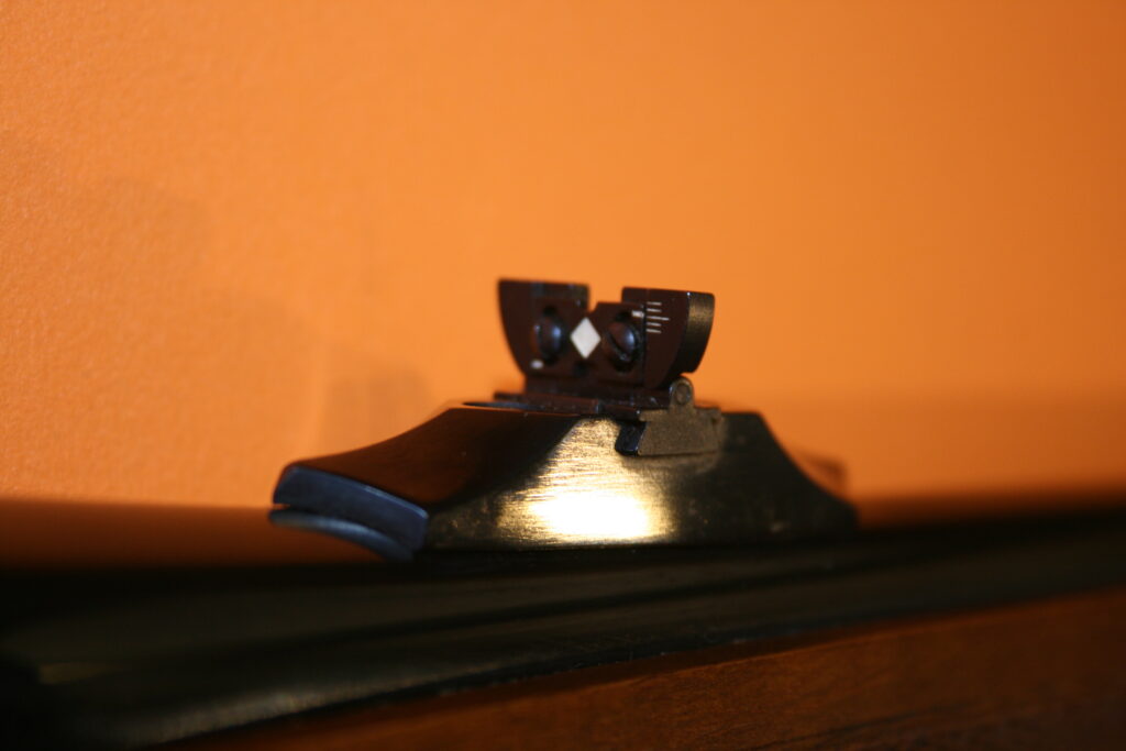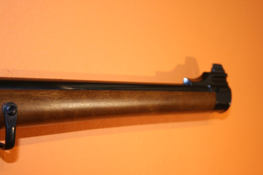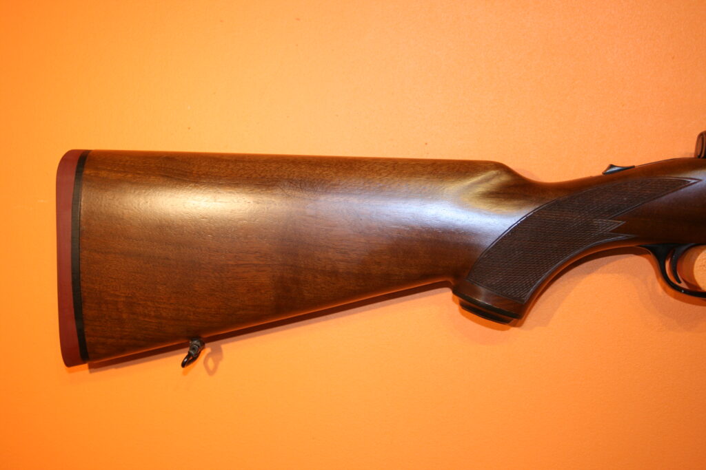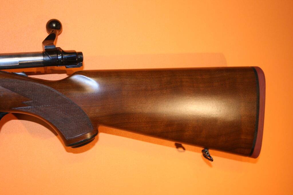 Carabine d’affût RUGER M77. Modèle à fût long en calibre .243 Winchester. Poids à vide : 3 Kg. Longueur du canon : 47 cm. Longueur de crosse : 34,5 cm. Longueur totale : 97,5 cm. Grenadières présentes. Départ de détente franc. Très bonne mécanique de type “Mauser”, fluide et inusable. Hausse rabattable et réglable. Magasin d’une capacité de 5 cartouches. Belle occasion présentant très peu de traces d’usage.